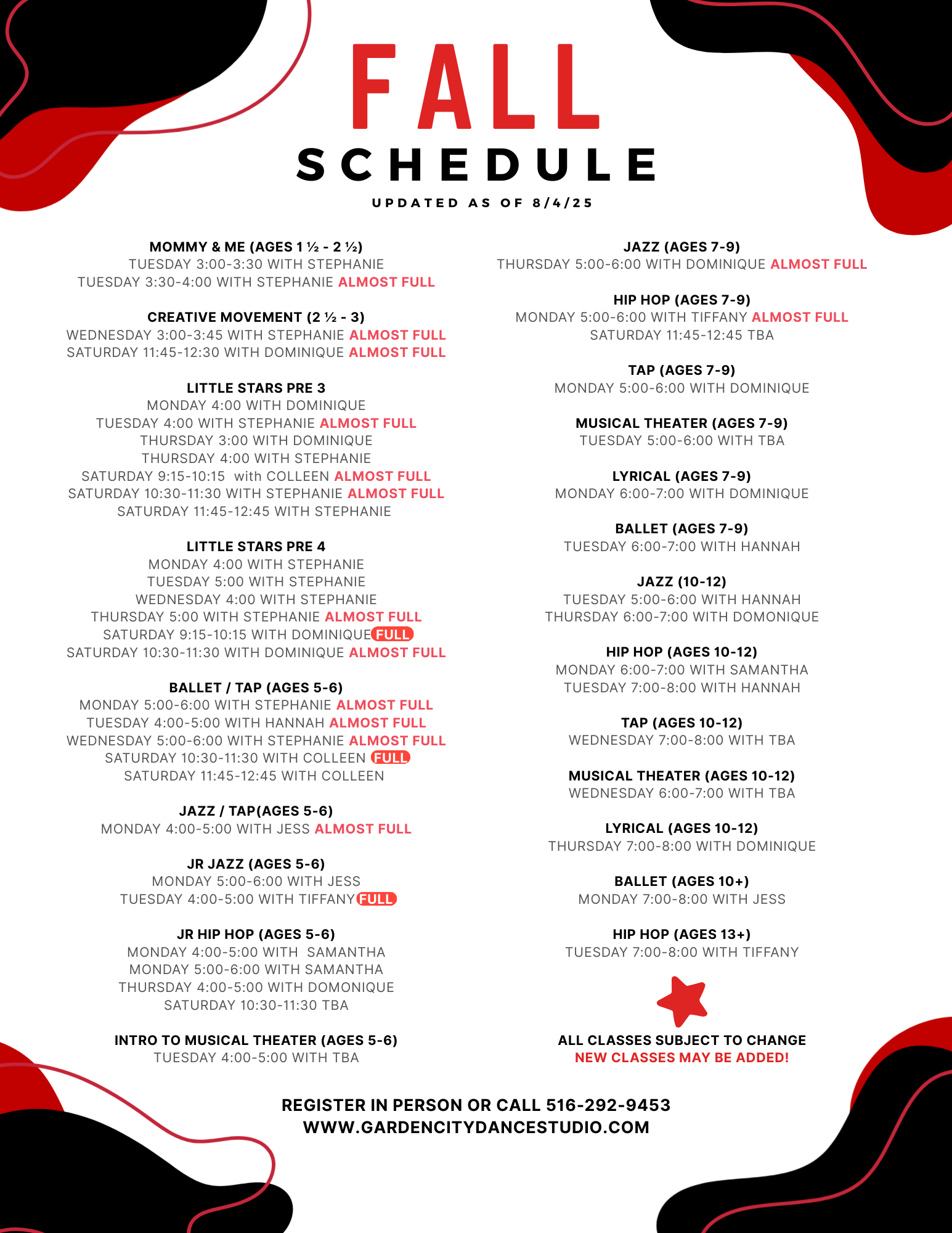 GARDEN CITY DANCE STUDIO SCHEDULE Summer Schedule (2025) Fall Schedule (2025/2026) Holiday Closings (2025/2026) Class Descriptions Audition Prep